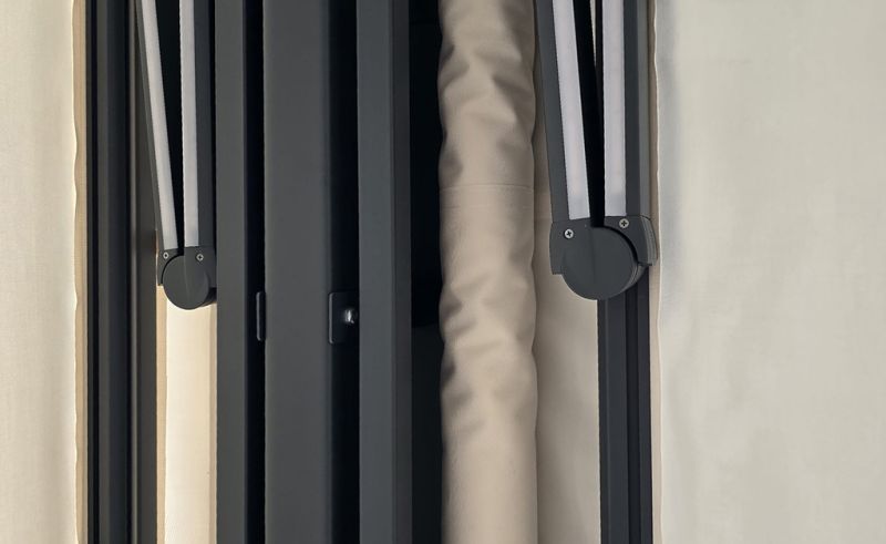 Pendant l’ouverture et la fermeture du store, le tissu peut subir des tensions localisées au niveau des coutures, là où le tissu est plus épais. Ce phénomène est particulièrement visible sur les modèles à cassette ou semi-cassette. Il n’affecte toutefois ni la durabilité, ni la structure de la toile – il s’agit d’un effet naturel du processus de fabrication.
