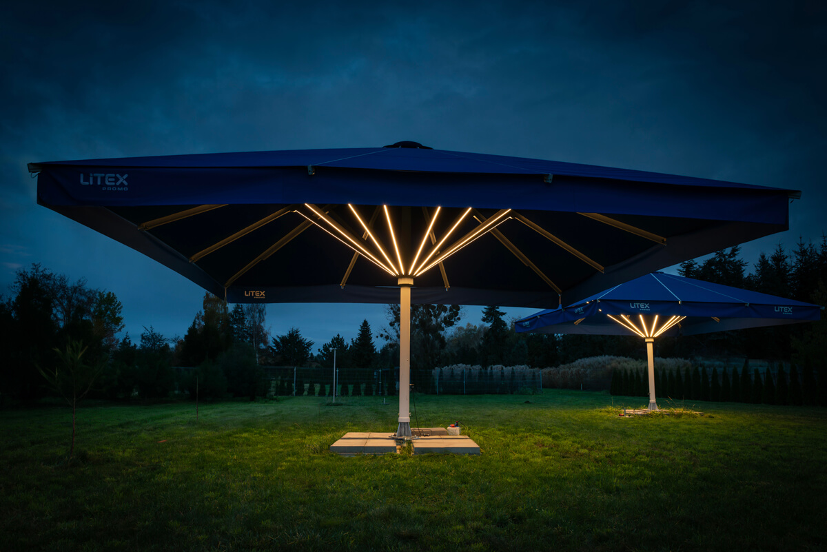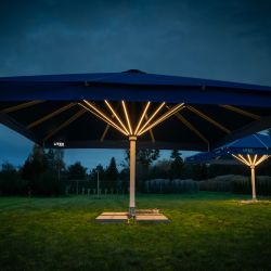 Ambiance après la tombée de la nuit – grand parasol de restauration avec éclairage LED