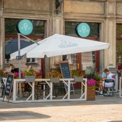 Nos parasols Rio Plus sont montés sur un bras articulé et disposent également d’un système d’ouverture avec réglage progressif de l’angle d’inclinaison de l’auvent. Grâce au pied latéral, nous avons la possibilité de placer n’importe quel meuble ou tout un ensemble de meubles sous le parasol. La couleur austère du parasol permet à la publicité d’être exposée de la manière la plus visible.