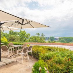 - la possibilité de mise en place libre des meubles sous l’auvent du parasol (mât latéral),