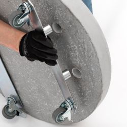 Le montage intuitif et par glissement du système de roulement sur le porte-parasol ne nécessite aucun outil. Un système de roulement bien conçu pour le porte-parasol vous permet d’éviter tout mouvement inattendu du parasol sur la surface sur laquelle il repose – les roulettes du porte-parasol sont équipées de freins, qu’il suffit de bloquer lorsque le parasol est arrivé à destination.